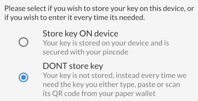 When you choose to NOT store your key on your device we advise you use our paper/digital wallet tool to create your backup.